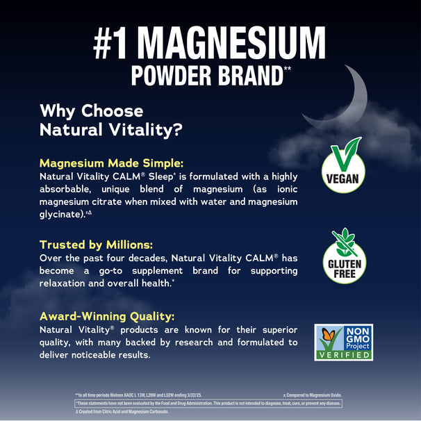 Since 1982, Natural Vitality® has been a trusted leader in magnesium supplementation, and Natural Vitality CALM® is the #1 Magnesium Powder Brand.** Discover the soothing power of magnesium with delicious CALM drink mix and add a little CALM to your nighttime routine.*