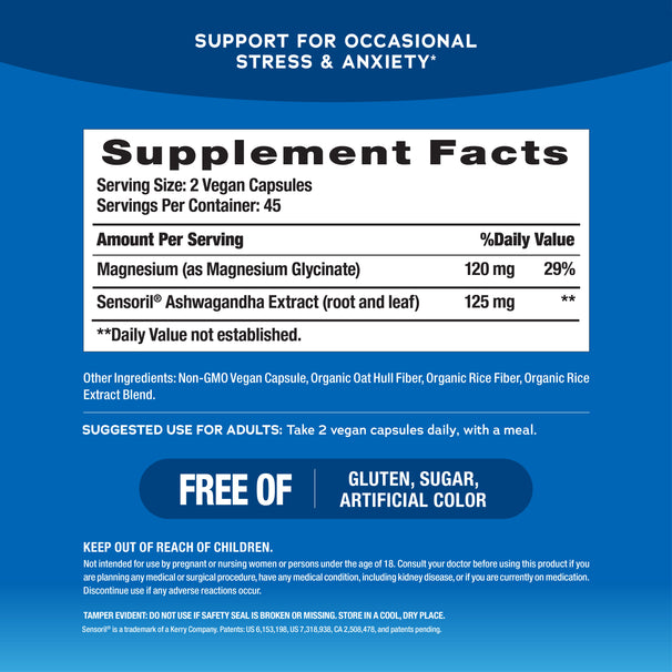 Zwei vegane Kapseln pro Tag liefern 120 mg hochverfügbares, vollständig chelatiertes Magnesiumglycinat als Basis der Formel, ohne Mischungen oder andere Magnesiumformen.† Eine potente Quelle von Sensoril® Ashwagandha-Extrakt wird bereitgestellt, um gelegentlichen Stress und Angst zu unterstützen.* Sensoril® Ashwagandha ist ein patentierter Ashwagandha-Wurzel- und Blattextrakt, der in zahlreichen Publikationen untersucht wurde.