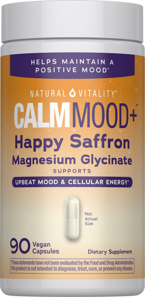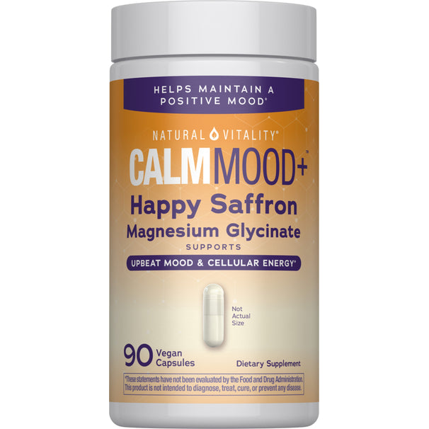 CALMMOOD+™ supplement features ionic Magnesium Glycinate, an essential mineral involved in hundreds of cellular processes, yet our bodies cannot produce it on its own. Everyday factors like diet, stress, certain medications, and lifestyle demands can affect magnesium levels. Natural Vitality® CALMMOOD+™ is vegan, with no gluten, sugar, or artificial color, and enhanced with Saffron Extract, a premium botanical studied for its mood-balancing and emotional wellness benefits.*