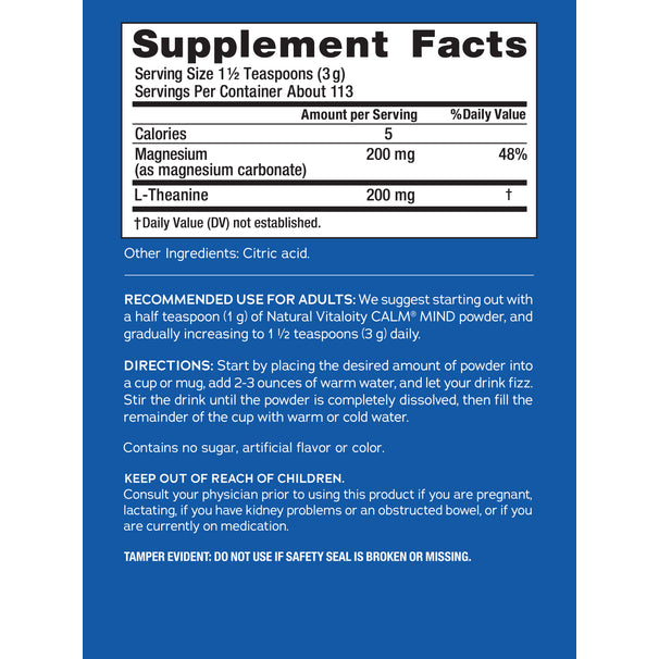 Daily challenges can leave your body and mind in overdrive. When your mind and body need a moment of calm, turn to Natural Vitality CALM® Mind.* This unflavored powder combines a highly absorbable form of the essential mineral magnesium, as ionic Magnesium Citrate, with L-Theanine, a beneficial amino acid that can help you manage occasional stress.†* Simply pour, fizz, mix, and enjoy a mindful pause whenever and wherever you need it.*