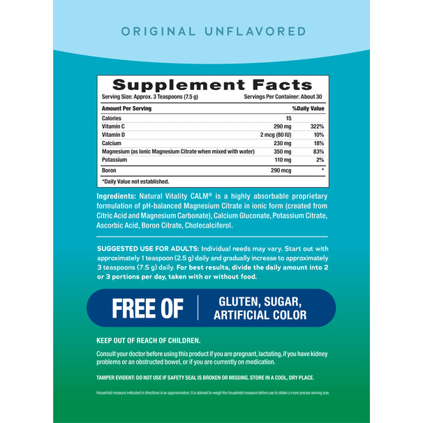 Natural Vitality CALM® Plus Calcium Unflavored Powder is your premium balanced Magnesium-Calcium drink mix that helps replenish daily magnesium levels, with additional vitamin and mineral support that delivers fast-acting support to help you feel the power of CALM.* Once combined with warm water, CALM fizzes and bubbles to life, transforming into a highly absorbable Ionic Magnesium Citrate.† This soothing cup of Natural Vitality CALM® is as much fun to make as it is to sip.*