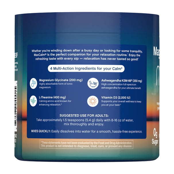MaxCalm® isn’t your average magnesium supplement — it’s calm support to the max.* Each serving combines 2x strength Magnesium Glycinate, KSM-66® Ashwagandha, L-Theanine, and Vitamin D3 for next-level relaxation and wellness support.* No muss, and no fuss. Just smooth, delicious enjoyment in every serving.
