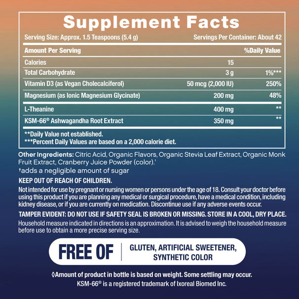 No gluten, no artificial sweeteners, no synthetic colors. Just a purposeful blend of quality ingredients in a great-tasting powder drink mix, to help you find your calm.* Because feeling good shouldn’t come with ingredients you can’t pronounce.