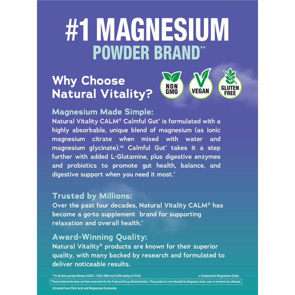 For over 40 years, Natural Vitality CALM® has been the go-to for those looking to support relaxation and well-being with water-soluble ionic magnesium citrate. As the #1 Magnesium Powder Brand,** it helps adults easily add a sense of CALM to their day.* A happy gut is the foundation for feeling like your best self, and with Natural Vitality CALM® Calmful Gut Wildberry Drink Mix, you can relax knowing you’re getting well-rounded support for digestive health and balance.*