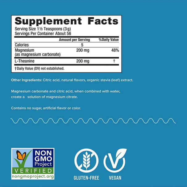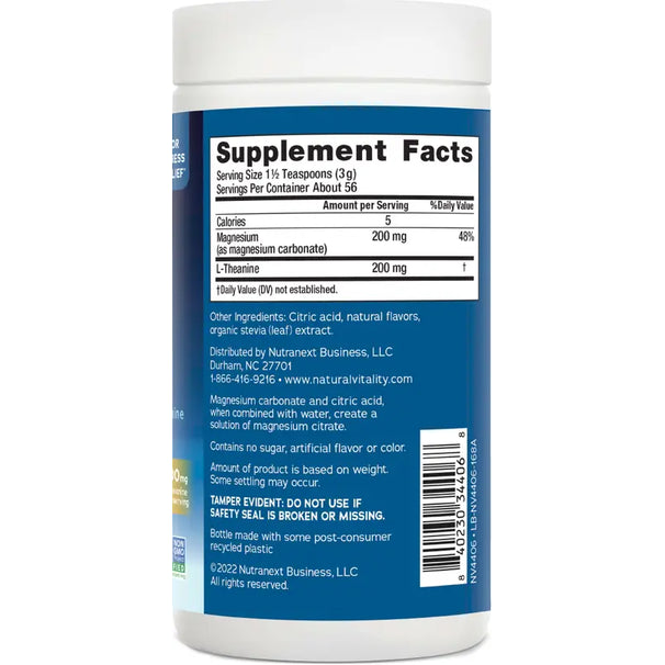 Natural Vitality CALM® is a highly absorbable proprietary formulation of pH-balanced Magnesium Citrate in ionic form (∆created from Citric Acid and Magnesium Carbonate), L-Theanine, Flavor, Organic Stevia (leaf) Extract.