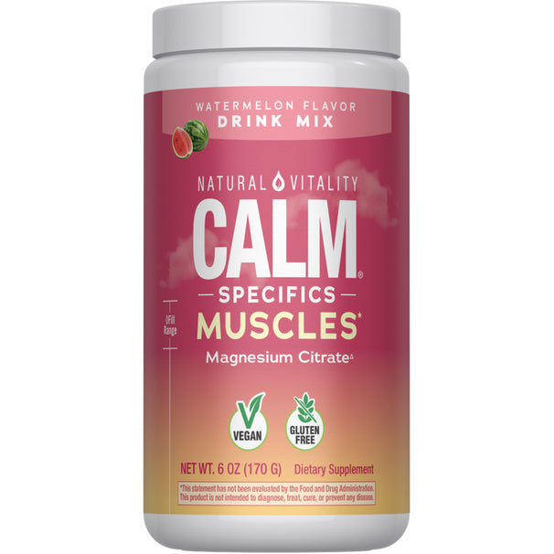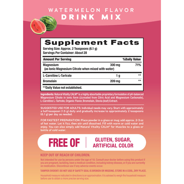 For over 40 years, Natural Vitality CALM® has been the go-to for those looking to support relaxation and well-being with water-soluble ionic magnesium citrate.△ As the #1 Magnesium Powder Brand,** it helps adults easily add a sense of CALM to their day.* Recovery is just as important as movement. Natural Vitality CALM® for Muscles Watermelon Drink Mix delivers a refreshing blend of magnesium, L-Carnitine, and Bromelain to support muscle health, function, and relaxation – all in one delicious, easy-to-mix formula.* Because strong muscles deserve a little TLC, too.*