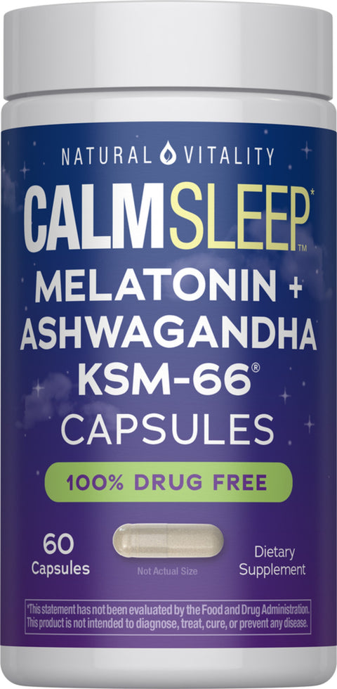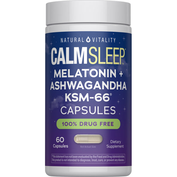 Designed for real life, Natural Vitality CALMSleep™ Melatonin + Ashwagandha KSM-66® Capsules offer advanced stress and sleep support.* Each serving delivers 5 mg of Melatonin and 600 mg of KSM-66® Ashwagandha root extract, a clinically studied botanical known for its potency and effectiveness, so you can rest and wake up feeling refreshed.*