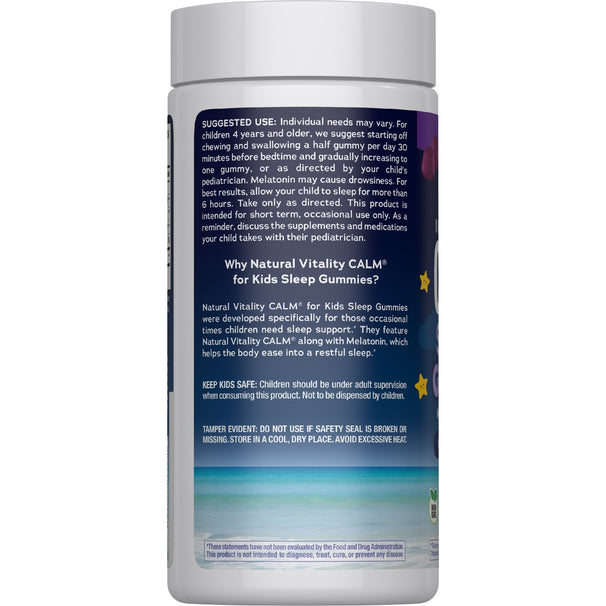Durante más de 40 años, Natural Vitality CALM® ha sido una opción confiable para familias que buscan los beneficios del magnesio. Ahora, nuestras Kids Sleep Gummies facilitan añadir un poco de CALM a su rutina nocturna.* Ya sea en casa o de viaje, Natural Vitality CALM® Kids Sleep Gummies ofrecen una deliciosa manera para que tu hijo reciba apoyo ocasional para dormir.*
