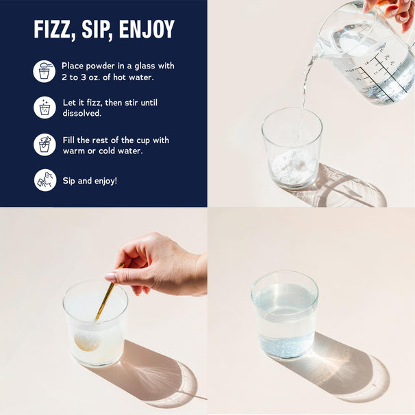 Para una preparación más rápida: Coloque el polvo en un vaso o taza; agregue aproximadamente 2-3 oz de agua caliente. Deje que burbujee, luego revuelva hasta que se disuelva. Complete con agua tibia o fría y disfrute. También puede simplemente agregar Natural Vitality CALM® a un vaso o botella de agua fría.