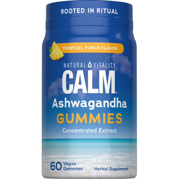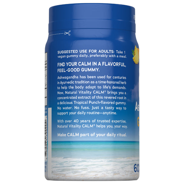 Ashwagandha has been used for centuries to help support the lifestyle, and now it’s available in a delicious tropical punch-flavored gummy you’ll love. Each vegan gummy delivers a concentrated Ashwagandha root extract in a convenient gummy form that’s free of gluten, artificial sweetener, and synthetic color. Whether it’s part of your morning ritual or an afternoon reset, Natural Vitality CALM® Ashwagandha Gummies make it easy to make CALM a part of your day.