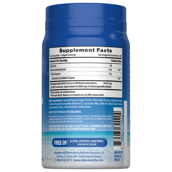 From the makers of the #1 Magnesium Gummy Brand**, Natural Vitality® introduces Ashwagandha Gummies, a new way to experience CALM — rooted in tradition, made for modern life. With over 40 years of expertise, this convenient and delicious gummy delivers the benefits of Ashwagandha in a form that fits your routine. No water, mixing, or blending required! Just CALM, your way.