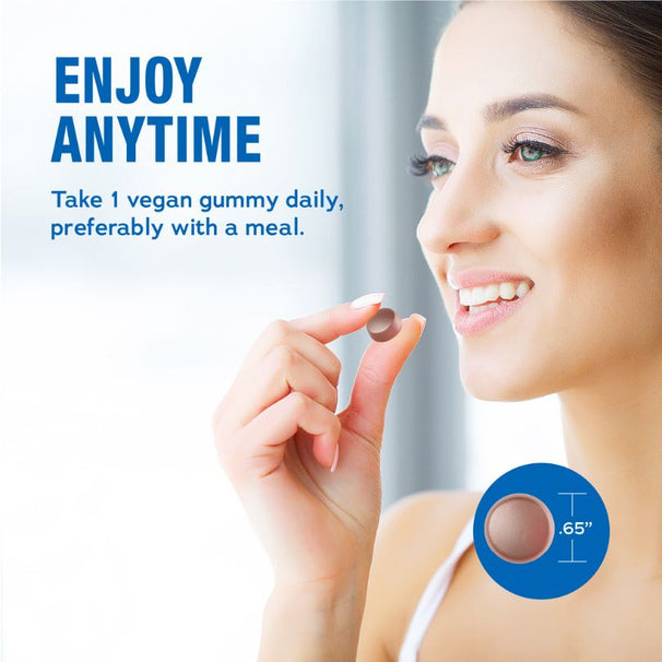 Adults can take one vegan gummy daily, preferably with a meal. Whether in the morning or afternoon, it can be taken anytime, anywhere. No water, mixing, or blending required!