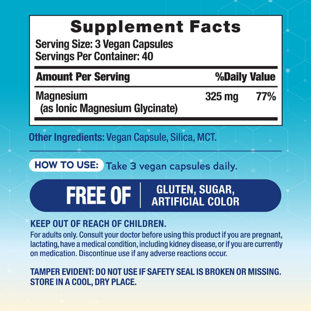 Tres cápsulas veganas al día brindan a tu cuerpo 325 mg de magnesio en forma de glicinato de magnesio iónico altamente absorbible.† Este mineral esencial apoya más de 300 procesos celulares en el cuerpo y ofrece una forma conveniente de calmar el cuerpo y la mente, ya sea que estés en casa o en movimiento.*