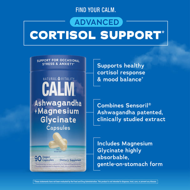 Depuis plus de 40 ans, Natural Vitality CALM® est le choix de confiance pour ceux qui recherchent relaxation et équilibre.* Notre héritage de délivrance de suppléments de magnésium de qualité continue avec ces capsules pratiques CALM Magnésium Glycinate + Sensoril® Ashwagandha. Soigneusement formulées pour soutenir l'équilibre et aider à soulager le stress et l'anxiété occasionnels, elles facilitent la recherche du calme, n'importe où et n'importe quand.* Car se sentir bien commence par trouver l'équilibre, à l'intérieur comme à l'extérieur.*