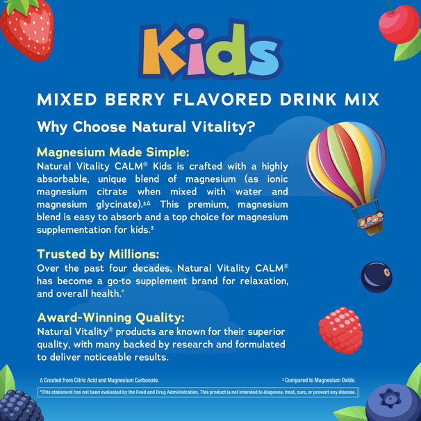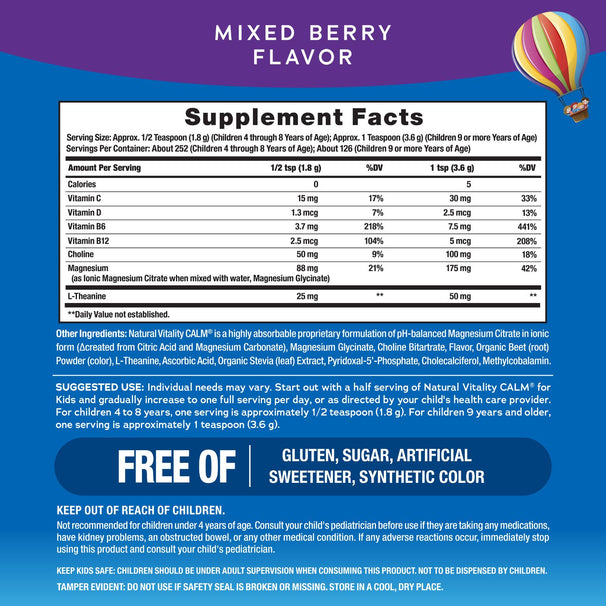 Les corps et les esprits en pleine croissance rencontrent également des défis ! La poudre Berry Kids de Natural Vitality CALM® offre une manière adaptée aux enfants pour soutenir le calme et la détente.* Formulée avec du magnésium hautement absorbable† (sous forme de citrate de magnésium ionique△ et de glycinate), cette délicieuse poudre à saveur de baies mélangées aide les enfants à se détendre après des journées bien remplies d'apprentissage, de jeu et de croissance.
