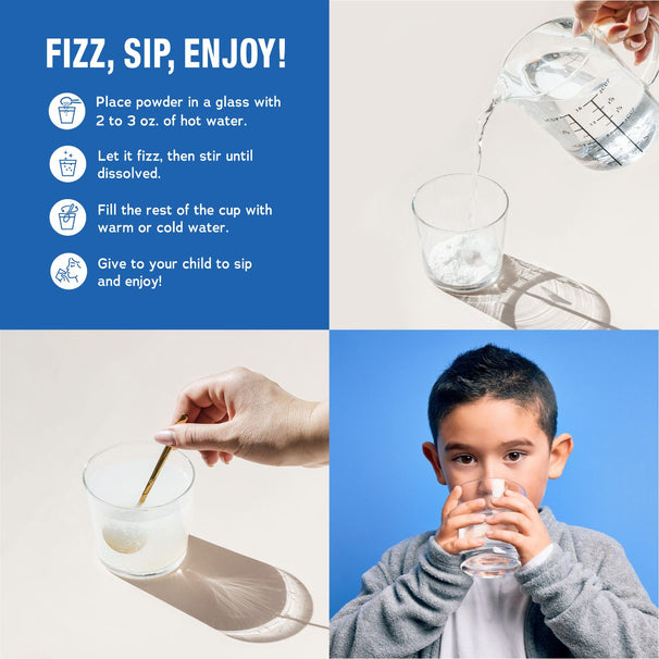 Versez simplement la poudre dans de l'eau chaude et regardez-la pétiller, puis remuez, sirotez et laissez votre enfant profiter du CALM.