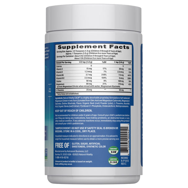 Utilisation suggérée: Les besoins individuels peuvent varier. Commencez avec une demi-dose de Natural Vitality CALM® pour enfants et augmentez progressivement à une dose complète par jour, ou selon les recommandations du professionnel de santé de votre enfant. Pour les enfants de 4 à 8 ans, une dose équivaut à environ 1/2 cuillère à café (1,8 g). Pour les enfants de 9 ans et plus, une dose équivaut à environ 1 cuillère à café (3,6 g).