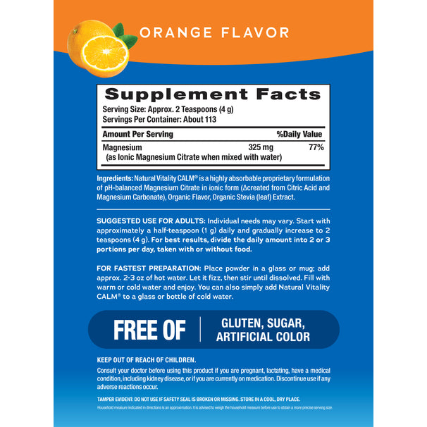 Après une longue journée, installez-vous pour un moment de paix et prenez Natural Vitality CALM®. Mesurez-le dans votre verre préféré, ajoutez de l'eau tiède et observez la poudre qui pétille et s'anime sous vos yeux. C'est la magie de CALM, un citrate de magnésium ionique hautement absorbable, prêt à soutenir la relaxation au moment où vous en avez le plus besoin.†△* Notre poudre facile à mélanger à saveur d'orange fournit 325 mg de magnésium sous forme de citrate de magnésium ionique par portion.△