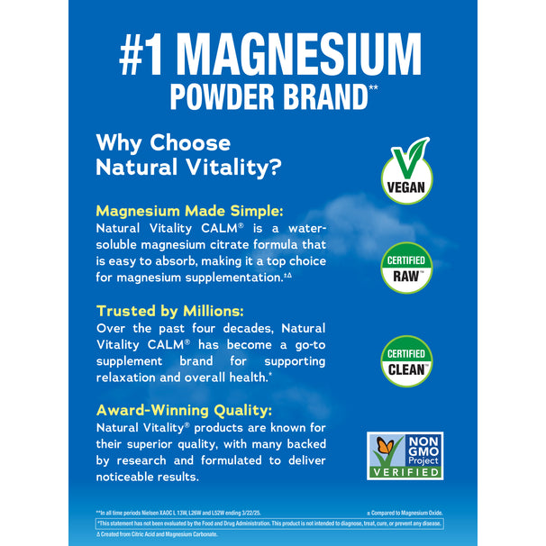 Natural Vitality CALM® se dissout facilement dans l'eau ou d'autres boissons pour être consommée comme complément, afin de soutenir des niveaux sains de magnésium.* Le magnésium est crucial pour des centaines de processus dans le corps.
