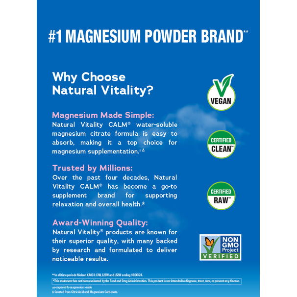 Natural Vitality Calm est une formulation propriétaire hautement absorbable de citrate de magnésium équilibré en pH sous forme ionique (créé à partir d'acide citrique et de carbonate de magnésium), saveur organique, extrait de stévia biologique.