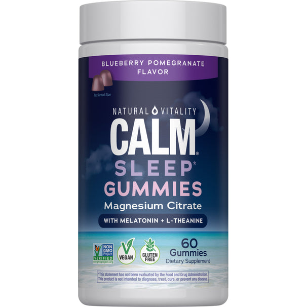 Ogni giornata lunga e impegnativa merita una notte di riposo calma e tranquilla. Le Natural Vitality CALM® Sleep Gummies forniscono Magnesio Citrato altamente assorbibile con Melatonina e L-Teanina per l'insonnia occasionale.*† Queste gomme vegane hanno un delizioso sapore di mirtillo e melograno, rendendole un modo piacevole per aiutarti a conciliare un sonno riposante.*