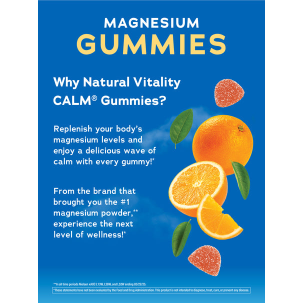 Since 1982, Natural Vitality CALM® has been a trusted leader in magnesium supplementation, helping millions embrace the benefits of this essential mineral. Delicious CALM gummies are #1 among consumers and a convenient way to experience the power of magnesium anytime, anywhere.** No water, mixing or blending required!
