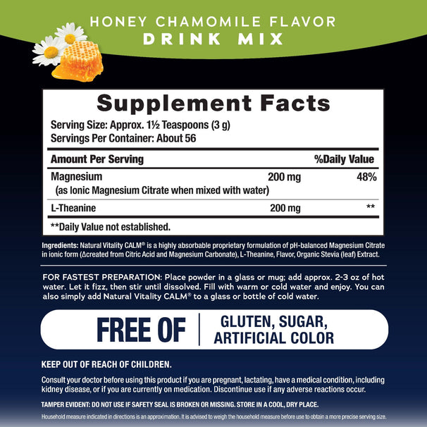 When your mind and body need a moment of calm, turn to Natural Vitality CALM® Mind.* This soothing honey chamomile flavored powder combines a highly absorbable form of the essential mineral magnesium, as ionic Magnesium Citrate, with L-Theanine, a beneficial amino acid that can help you manage occasional stress.†△* Simply pour, fizz, mix, and enjoy a mindful pause whenever and wherever you need it.*