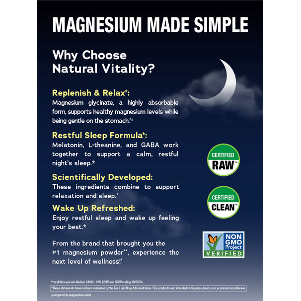 Natural Vitality CALM® Sleep* delivers highly absorbable magnesium as Magnesium Glycinate†, Melatonin, GABA, L-Theanine, and Vitamin D as Ergocalciferol.