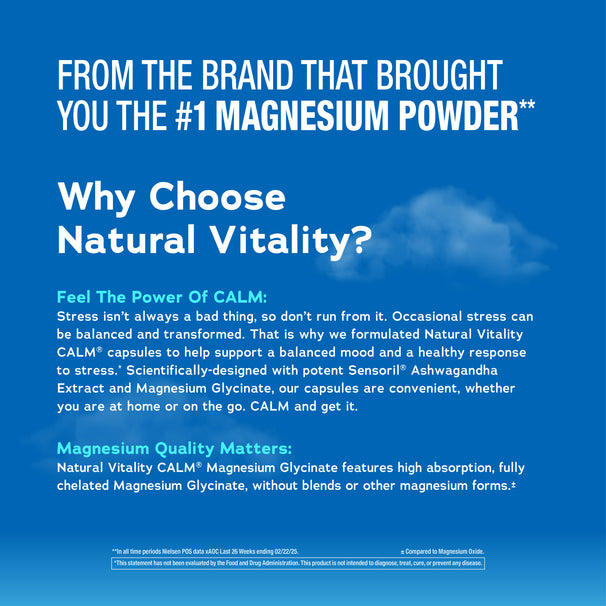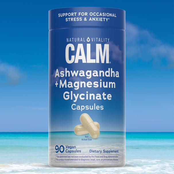 Por mais de 40 anos, Natural Vitality CALM® tem sido a escolha de confiança para aqueles que buscam relaxamento e equilíbrio.* Nosso legado de oferecer suplementos de magnésio de qualidade continua com estas cápsulas convenientes de Glicinato de Magnésio CALM + Sensoril® Ashwagandha. Cuidadosamente formuladas para apoiar o equilíbrio e ajudar a aliviar o estresse e a ansiedade ocasionais, elas tornam fácil encontrar sua calma, a qualquer momento e em qualquer lugar.* Porque sentir-se bem começa com encontrar equilíbrio, por dentro e por fora.*
