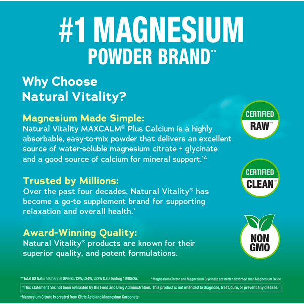 Desde 1982, a Natural Vitality® é líder confiável em suplementação de magnésio, e o Natural Vitality CALM® é a Marca Nº1 de Pó de Magnésio.** Descubra o poder calmante do magnésio e do cálcio, em uma deliciosa mistura de bebida CALM.*